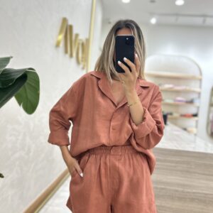 KETEN GÖMLEK ŞORT TAKIM KİREMİT