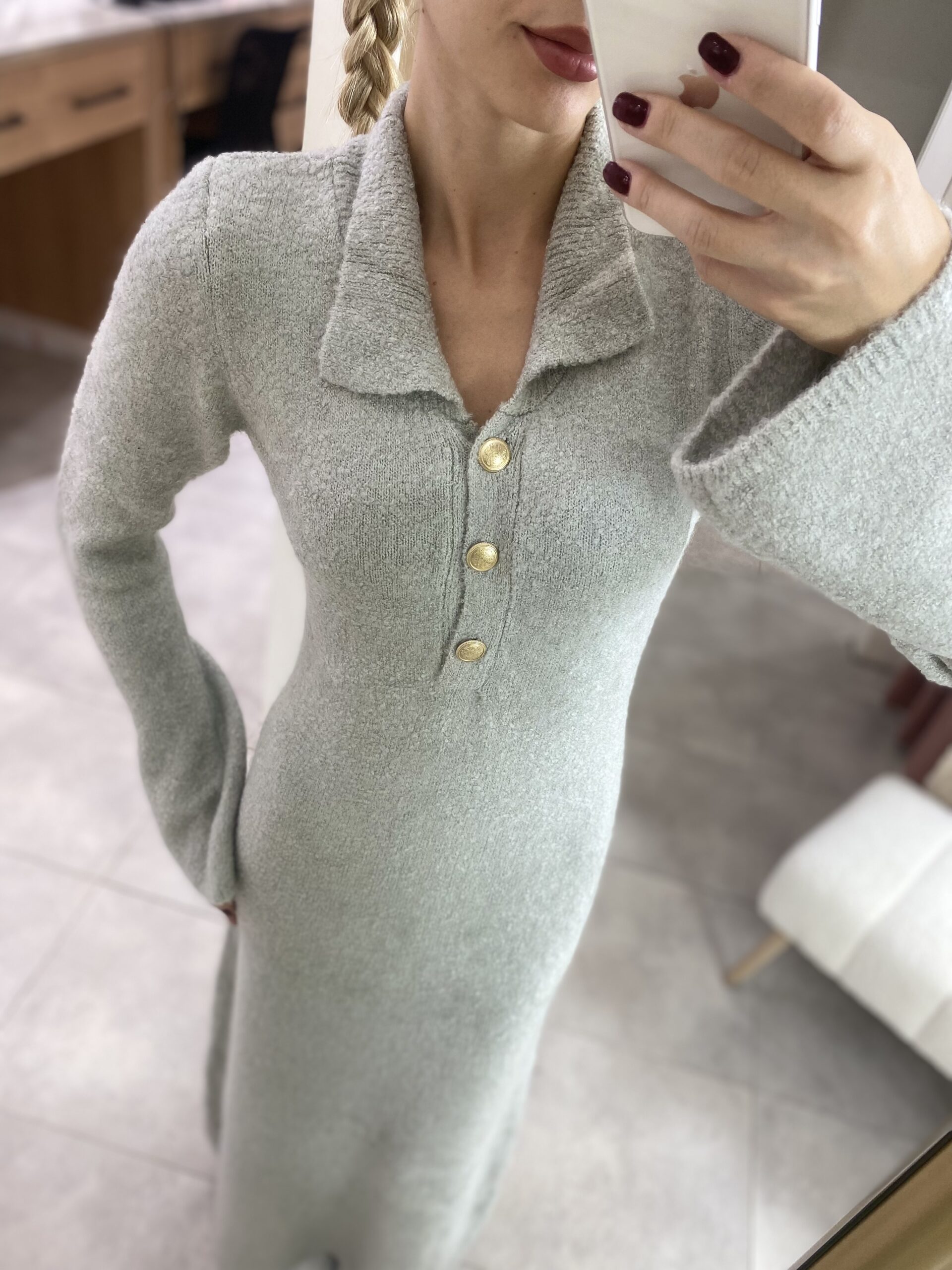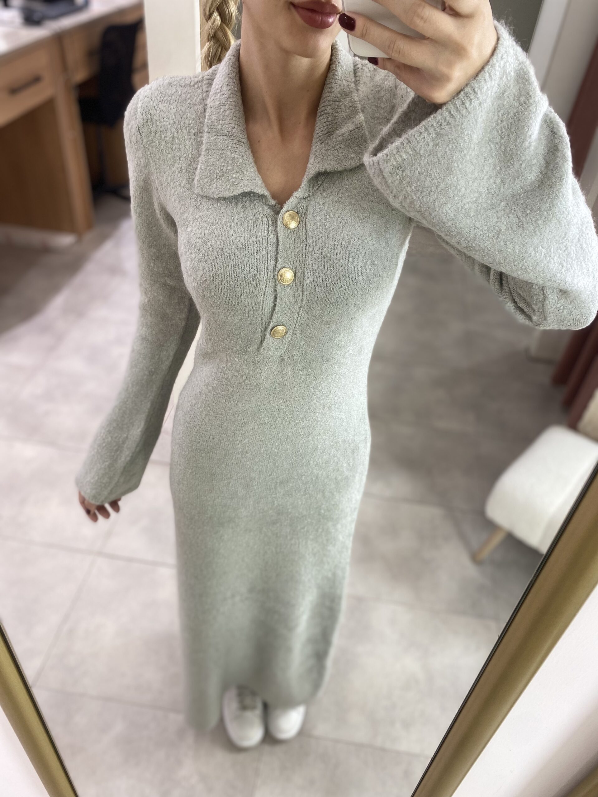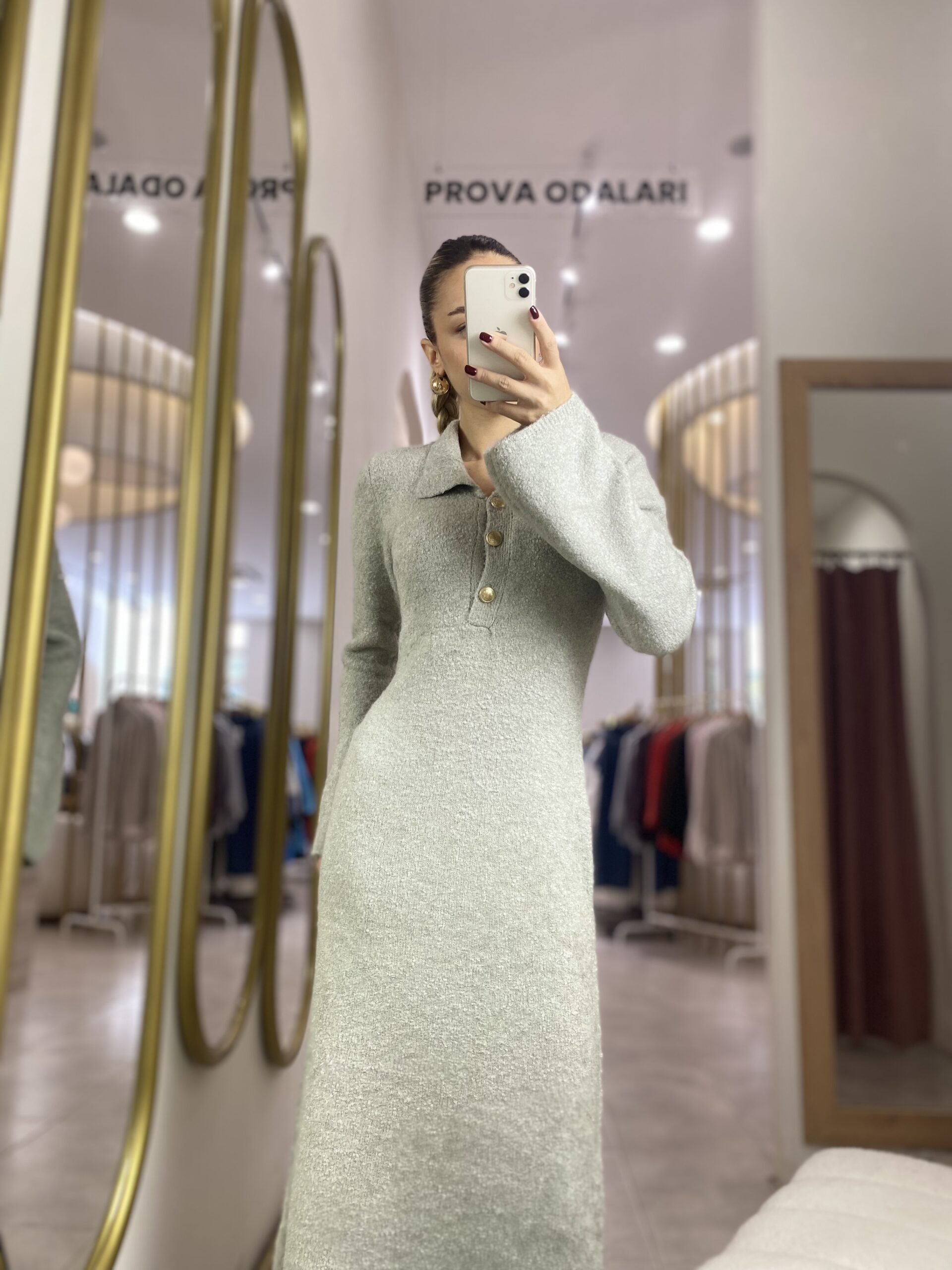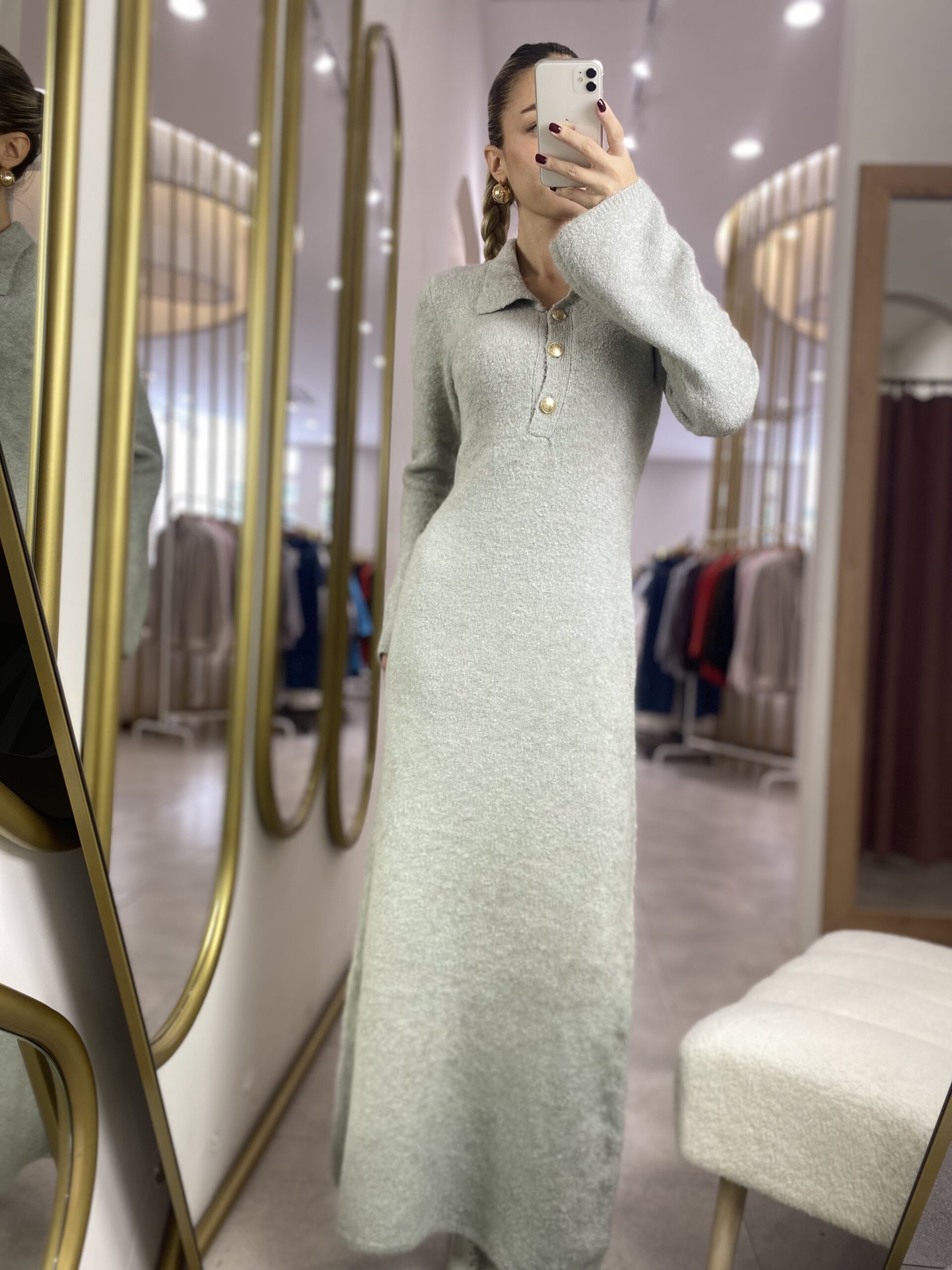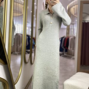 TRİKO GRİ UZUN ELBİSE GOLD DÜĞMELİ